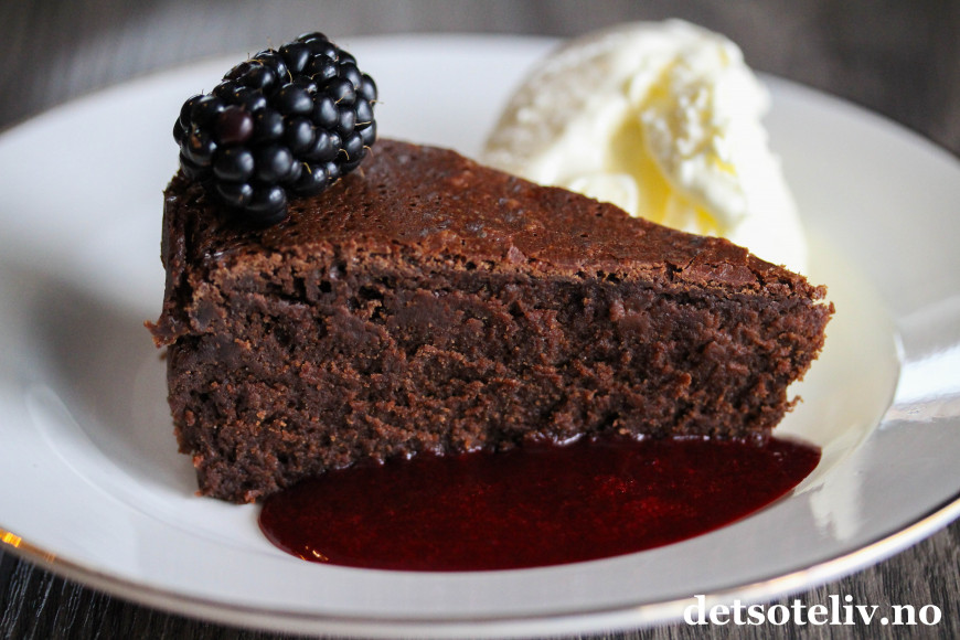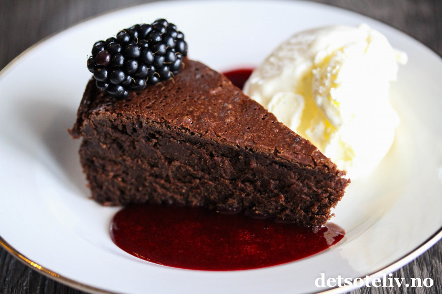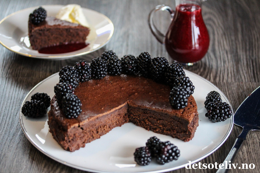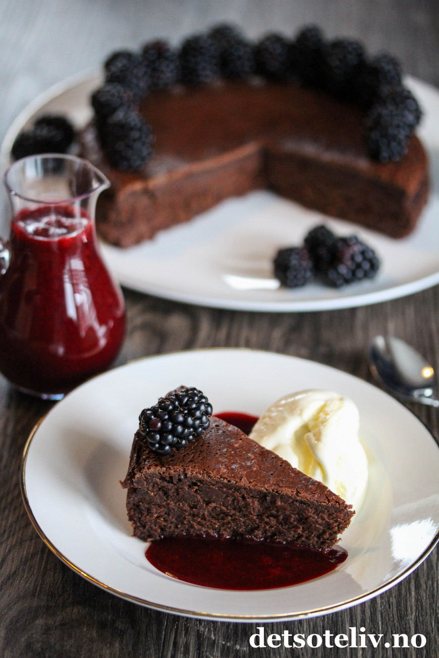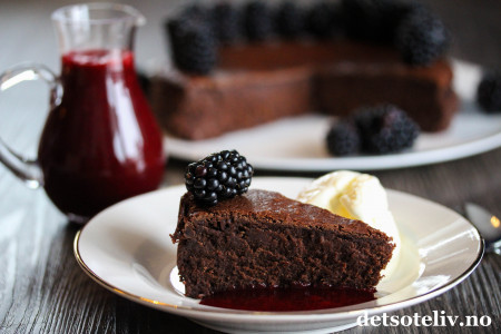 Server bjørnebærsausen (og gjerne også litt vaniljeis) som tilbehør til sjokoladekaken.