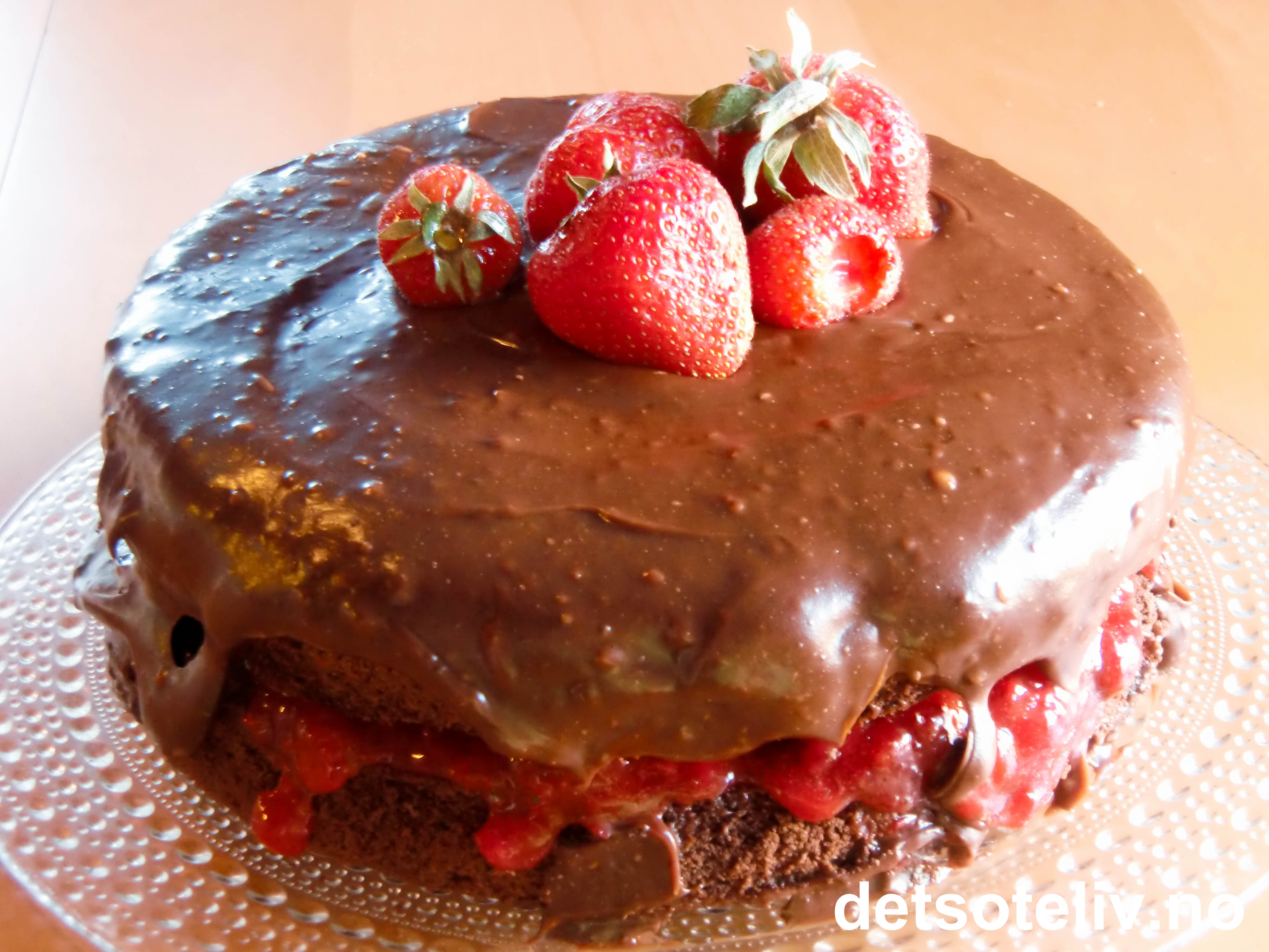 Fordel deigen i to runde former (26 cm i diameter) med bakepapir i bunnen. Stek kakebunnene midt i ovnen ved 180°C i ca 45-60 min (sjekk med kakenål når kakene er gjennomstekte). Avkjøl kakene i formen før de tas ut. Fjern bakepapiret og sett kakebunnene sammen med masse rørt jordbærsyltetøy mellom. Sett kaken i kjøleskapet mens du lager sjokoladeglasuren.