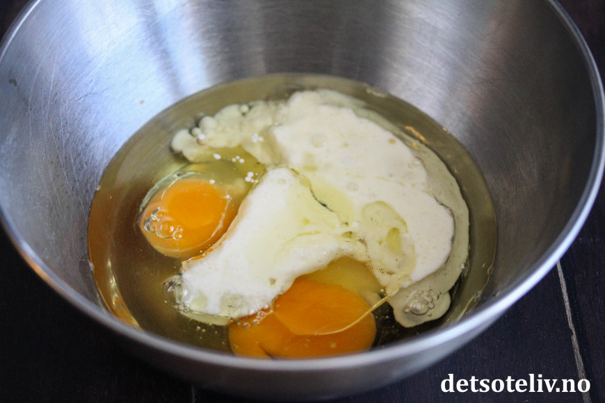 I en annen bolle vispes eggene lett sammen med surmelk, olje og vaniljeekstrakt.