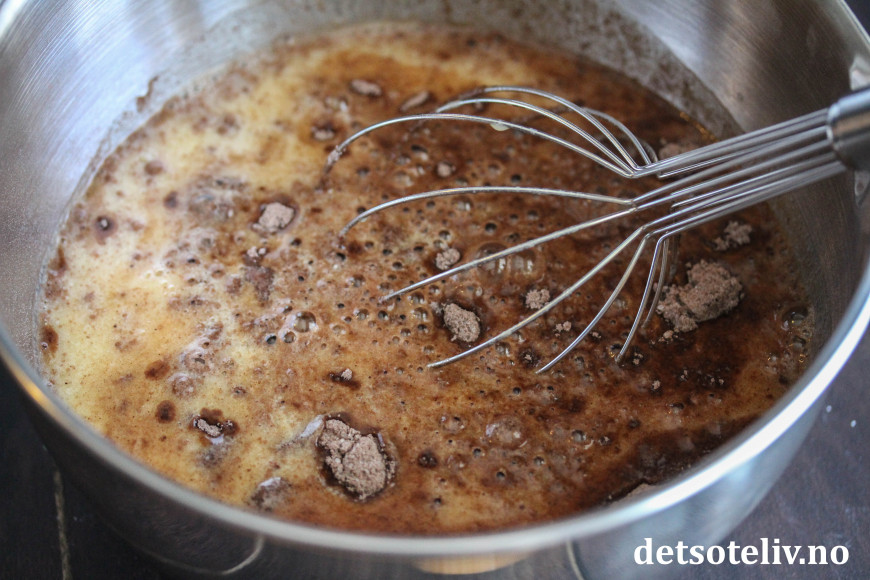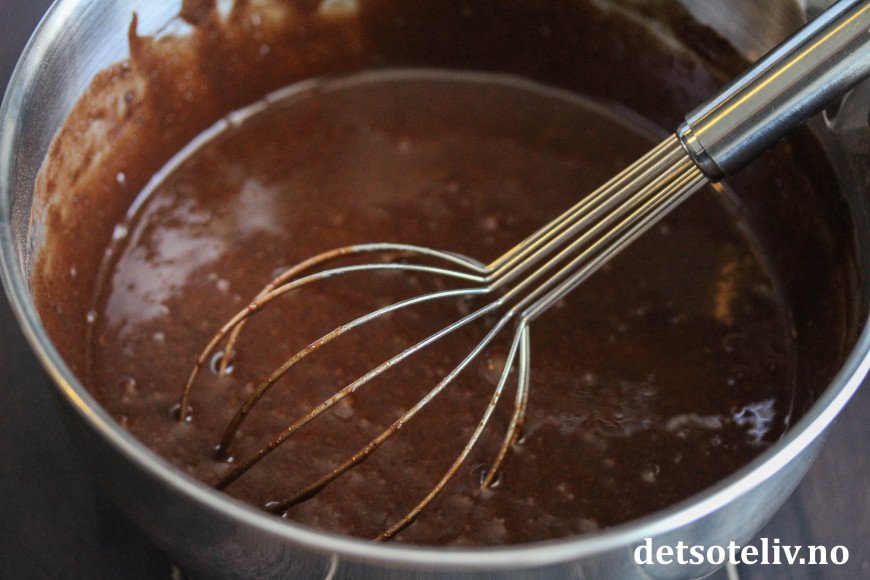 Rør deigen raskt sammen med en ballongvisp (den skal bli nokså tynn i konsistensen).