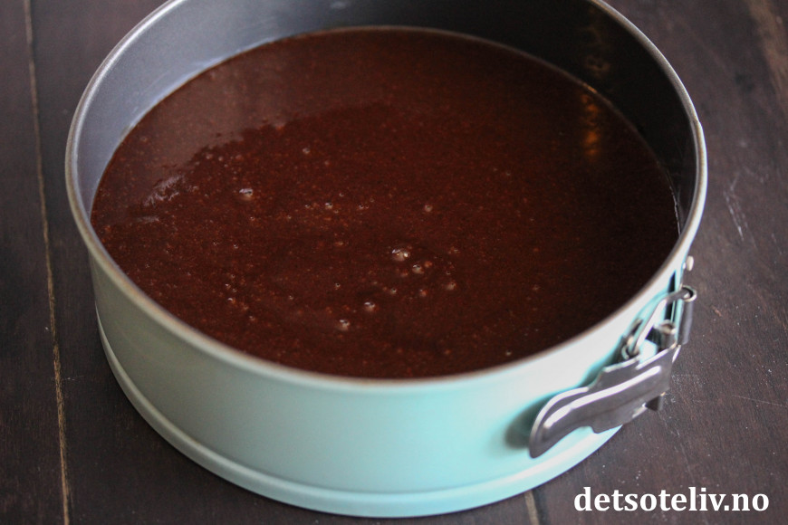 Spray bunn og kanter på en liten, rund kakeform (20 cm i diameter) med formfett, og kle bunnen av formen med bakepapir. Hell kakerøren i formen.