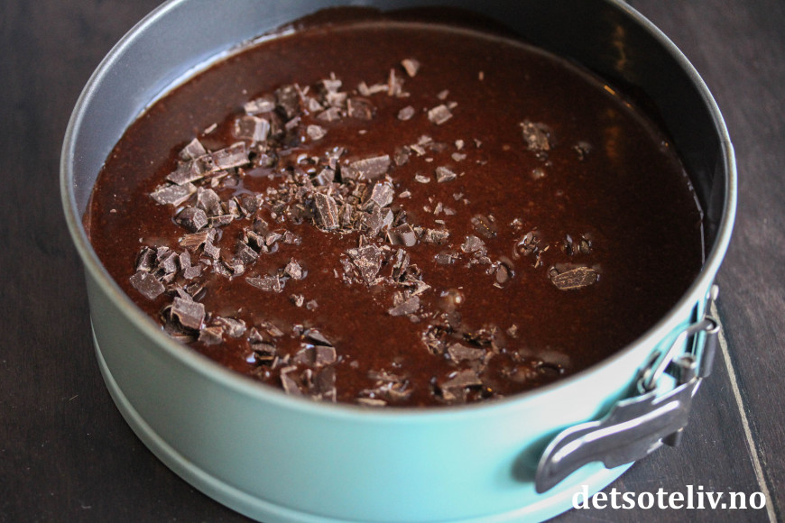 Hakk kokesjokoladen og fordel sjokoladebitene på toppen av deigen. Rør litt med en gaffel, så noen av sjokoladebitene blander seg med deigen mens noen blir liggende oppå deigen.
