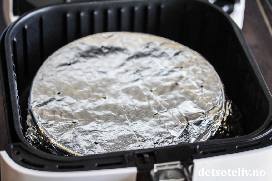 Sett kakeformen med aluminiumsfolien forsiktig ned i skuffen på airfryeren.