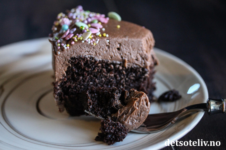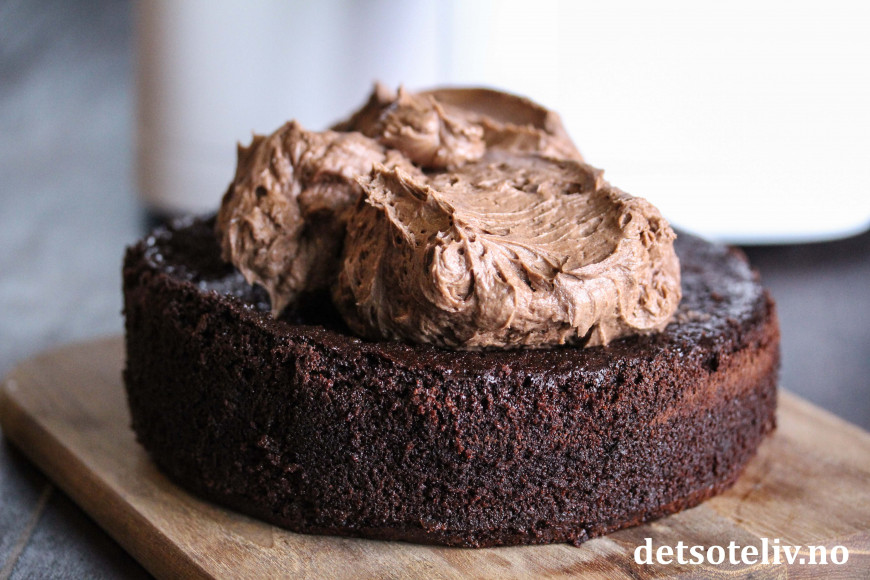 Jeg dekket sjokoladekaken med en deilig sjokoladekrem, men sjokoladekaken er faktisk supergod som den er uten sjokoladekrem og eventuelt bare et lite melisdryss.
