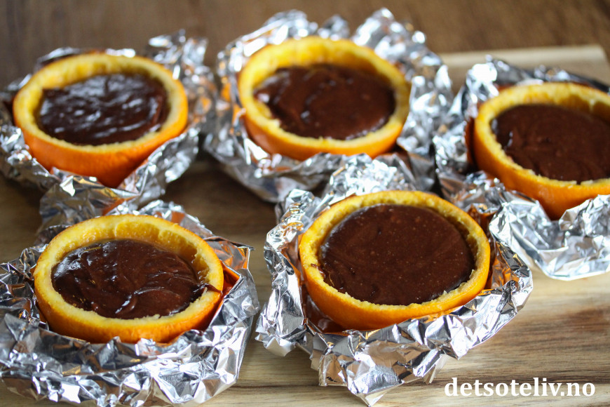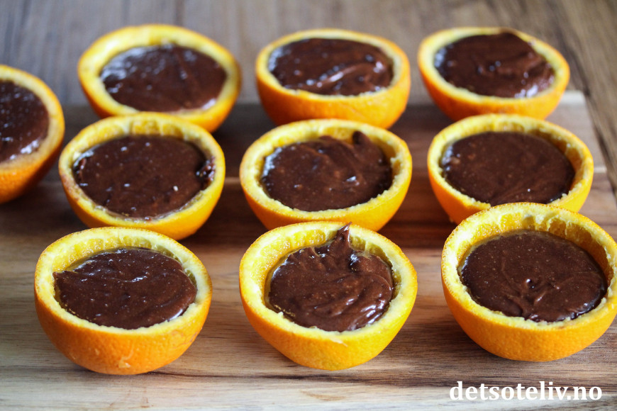 Fyll sjokoladedeigen i de uthulede appelsinene.
