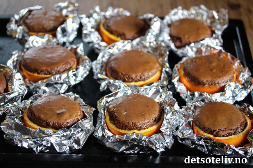 ♥ Jeg minner igjen om at appelsinene ikke må fylles opp for mye med sjokoladedeig, ellers vil deigen bare renne ut av appelsinskallet under stekingen.