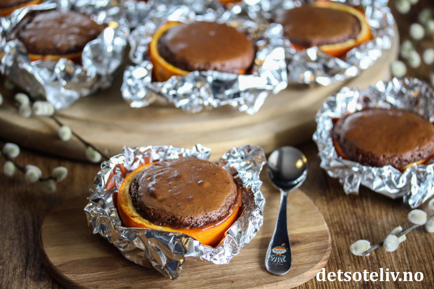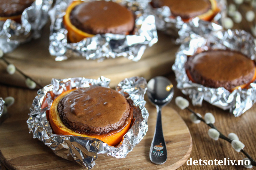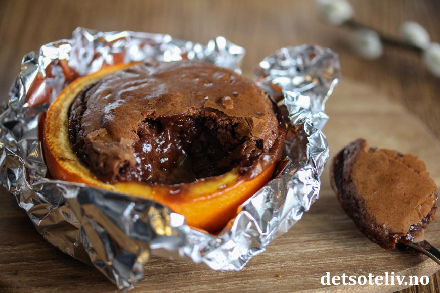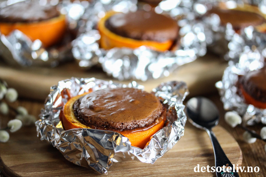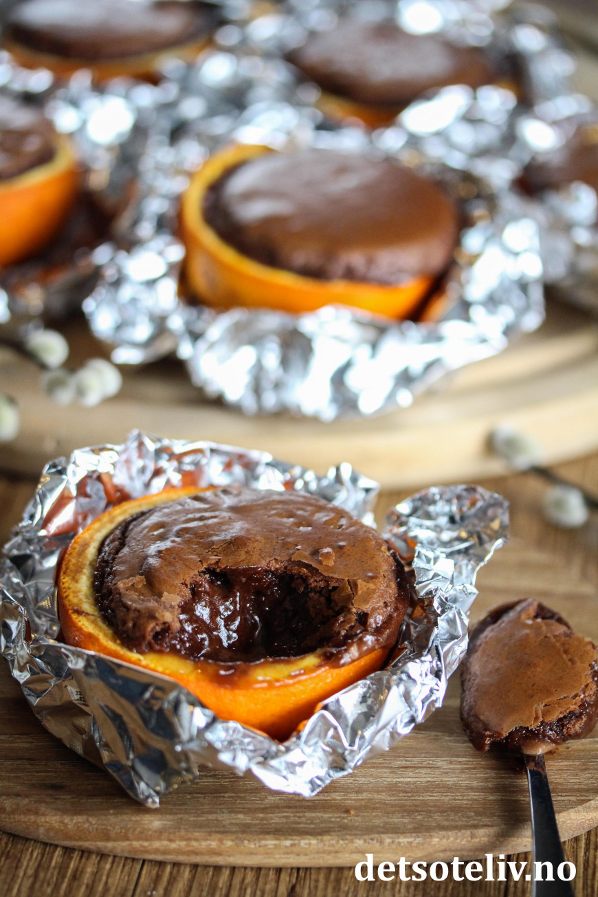 ♥ Tilpass steketiden. Jeg ønsker å ha flytende kjerne i sjokoladekakene, og fikk det ved å steke appelsinen i 20 minutter. Ønsker du kaken mer gjennomstekt, er det bare å øke tiden til 25-30 minutter. Steketiden er noenlunde den samme også på grill / over bål som i stekeovnen, men sjekk konsistensen på kaken innimellom under stekingen. Husk dessuten at sjokoladekaken vil være mer flytende når den er varm enn etter avkjøling.