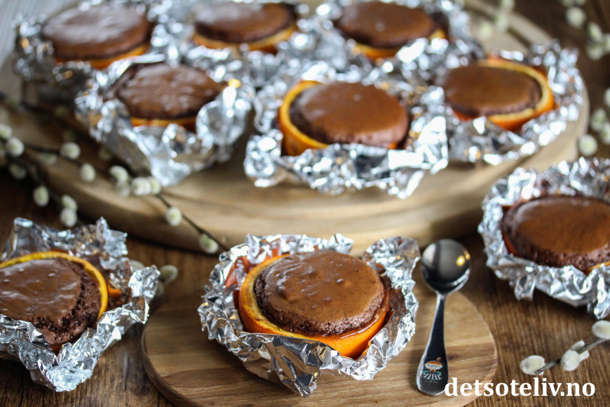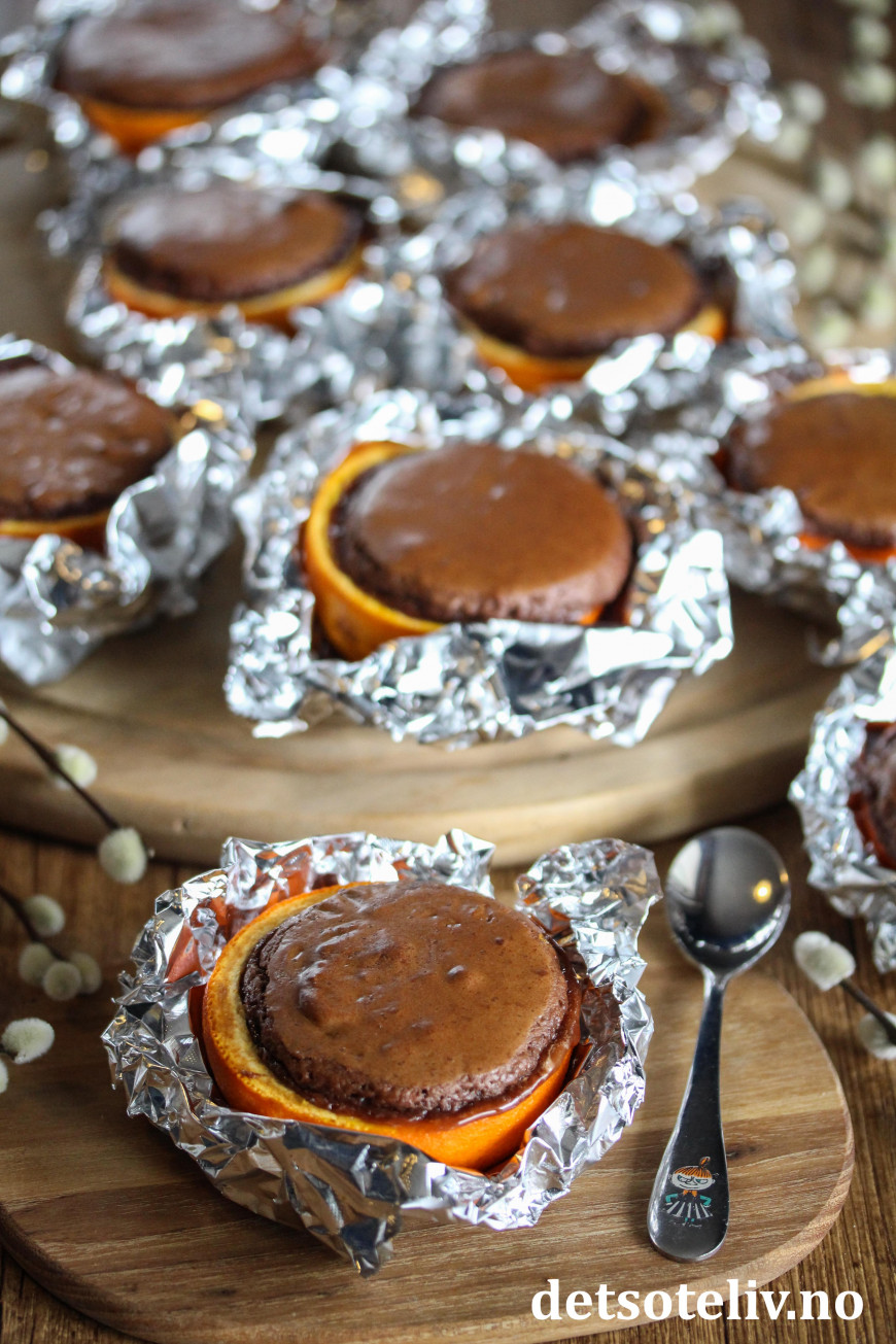 Er det noe som er herlig og stemningsfullt å servere i påsken, så er det Sjokoladekakebrownie stekt i appelsiner! 😀