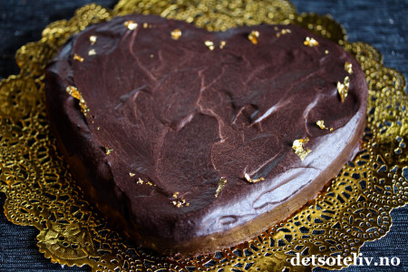 Ha deigen i en smurt hjerteform (1,5 liter) med bakepapir i bunnen (se tips). Stek kaken nederst i ovnen ved 175°C i 20 min. Avkjøl kaken helt i formen. Løsne kaken fra formen med en skarp kniv og hvelv den forsiktig ut av formen. Fjern bakepapiret og sett kaken på et passende fat.