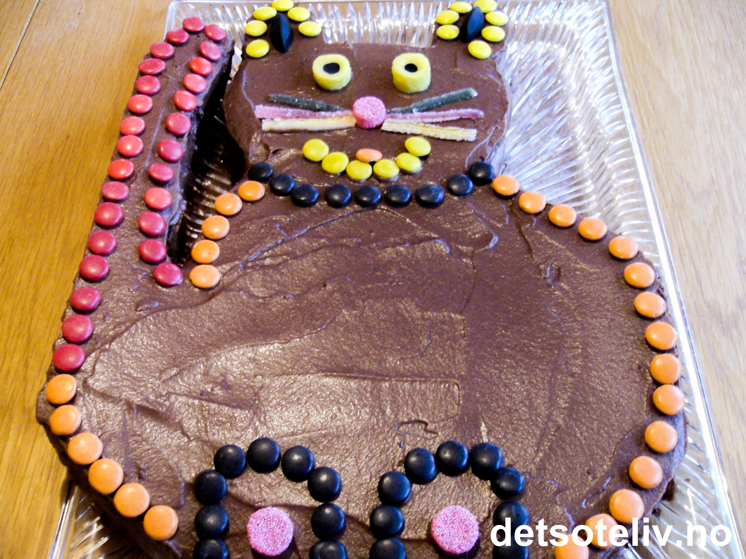 Når du skal skjære ut kaken i kattefasong kan det være lurt å først skjære helt forsiktig på toppen av kaken med en liten kniv. Da kan du justere deg frem til den fasongen du ønsker før du skjærer helt igjennom. De små riftene på toppen av kaken blir borte når du dekker over med sjokoladekremen.
