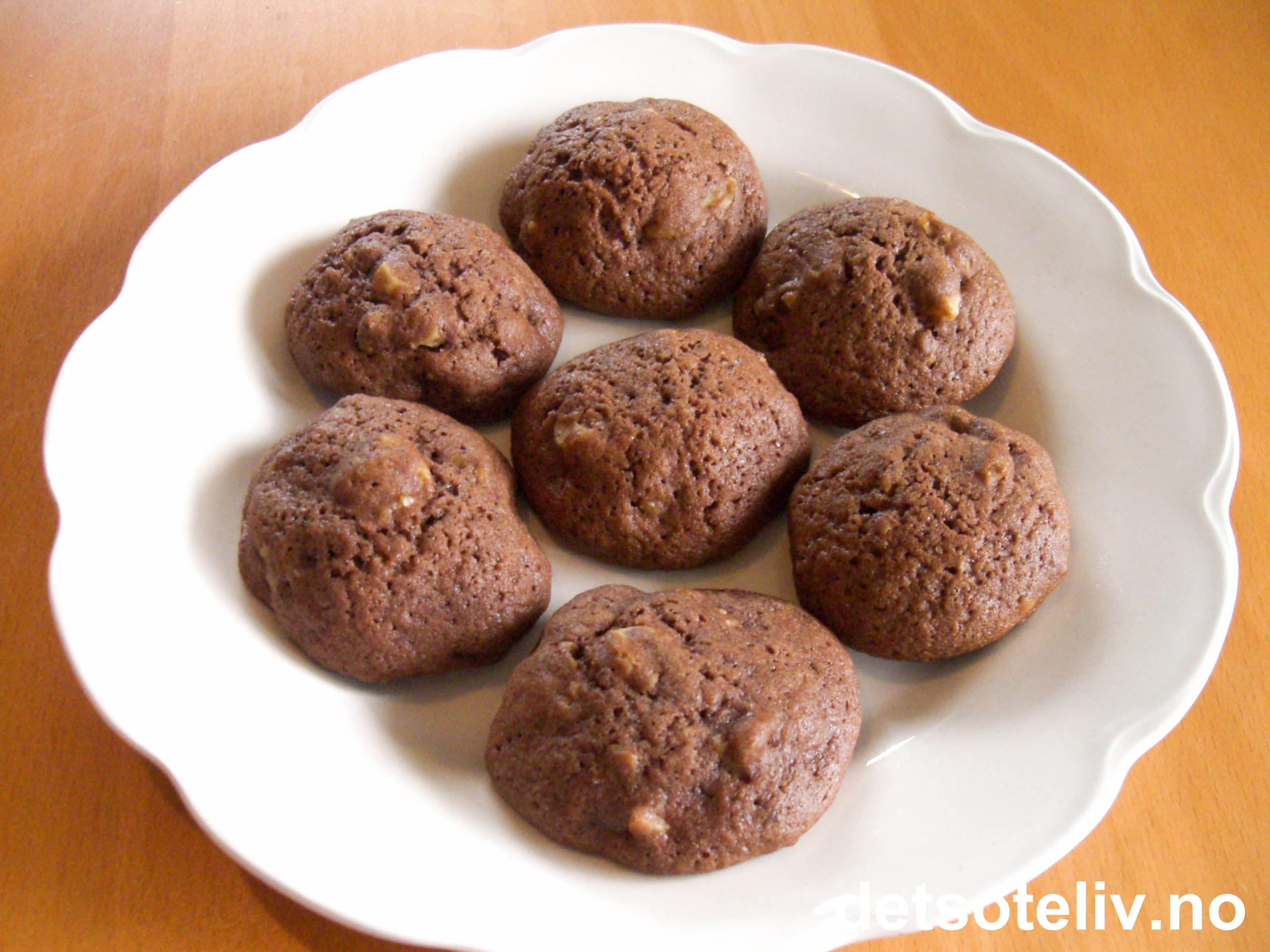Pisk mykt smør og sukker til smørkrem. Pisk inn eggene. Sikt i bakepulver, kakao og hvetemel og bland deigen sammen. Bland til slutt i grovt hakkede valnøtter. Sett deigen i kjøleskapet i 30 min dersom du synes den virker svært bløt i konsistensen.