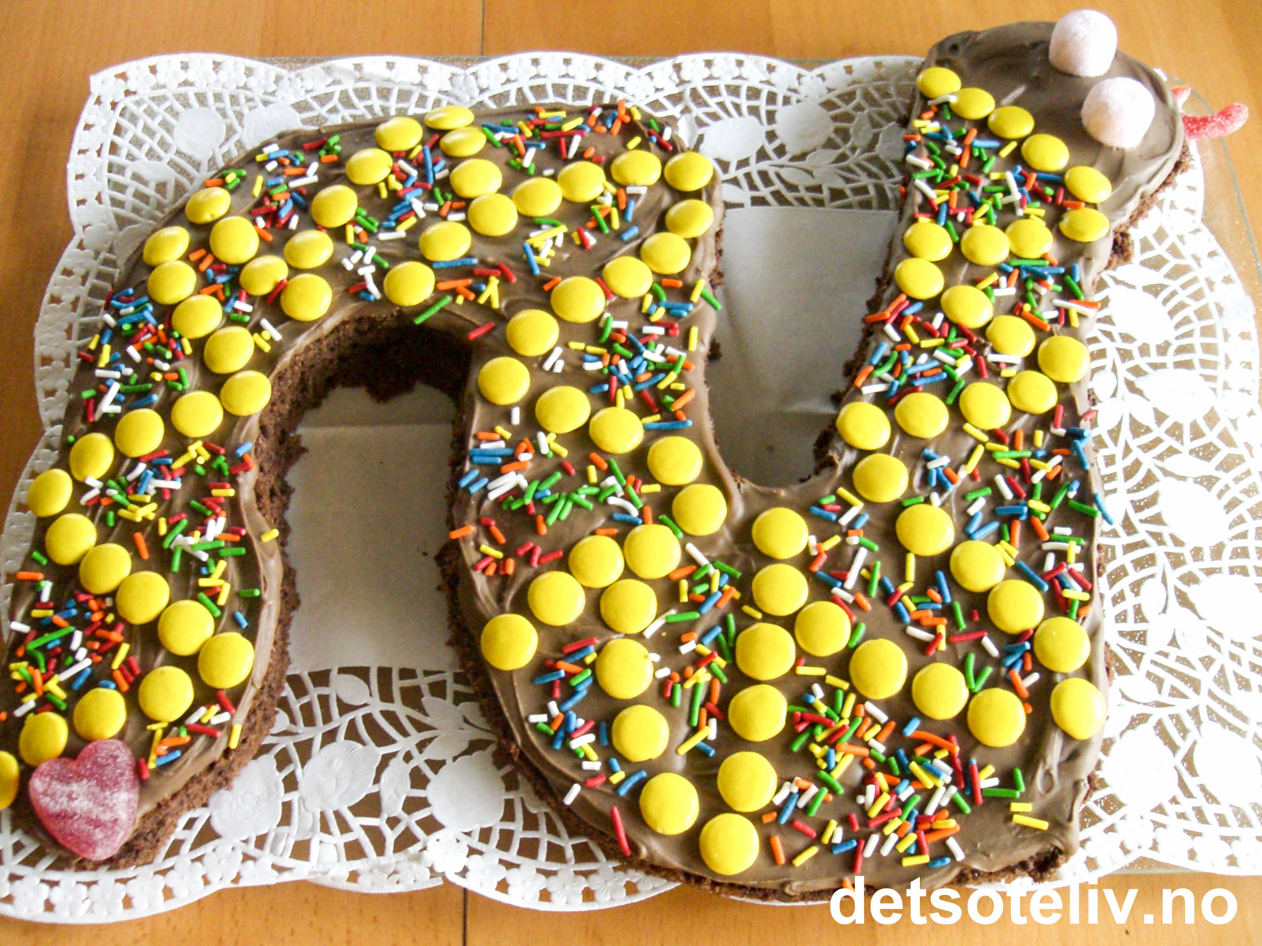 Smør glasuren jevnt over kaken og pynt slangen med godteri.