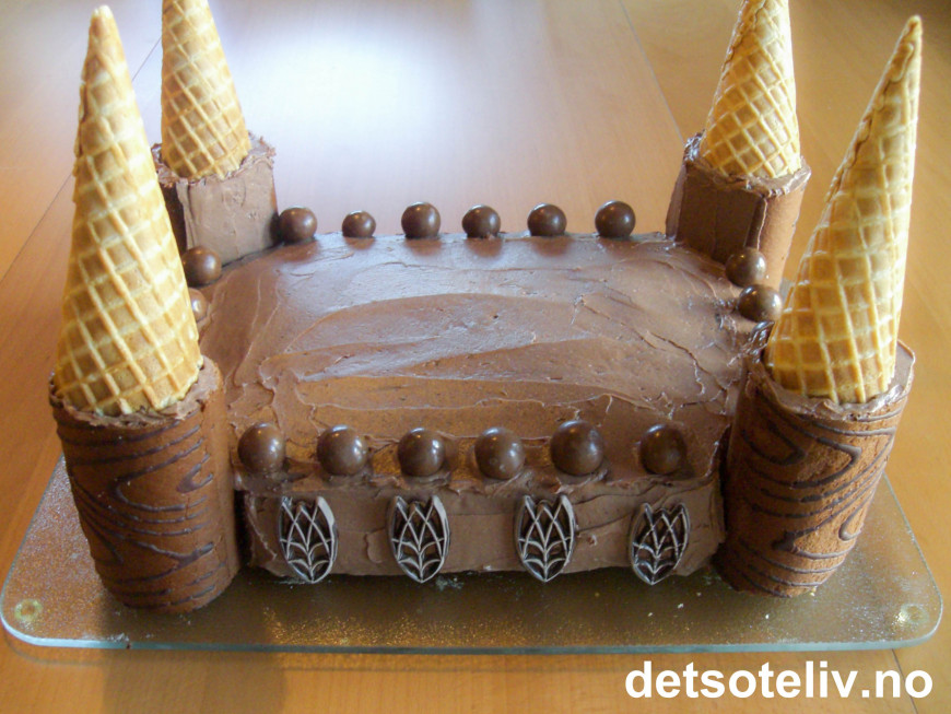 Smør sjokoladekrem over hele toppen og sidene av kaken. Del hver rullekake i to og klem dem inntil hjørnene. Smør sjokoladekrem på toppen av rullekakene og trykk nedi et iskjekskremmerhus på hver. Pynt slottet med sjokoladedekor etter ønske.