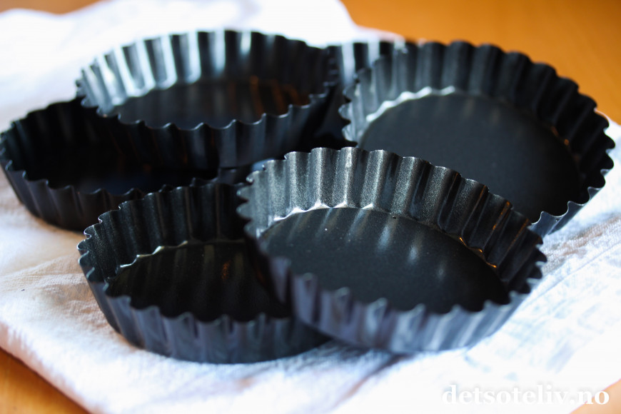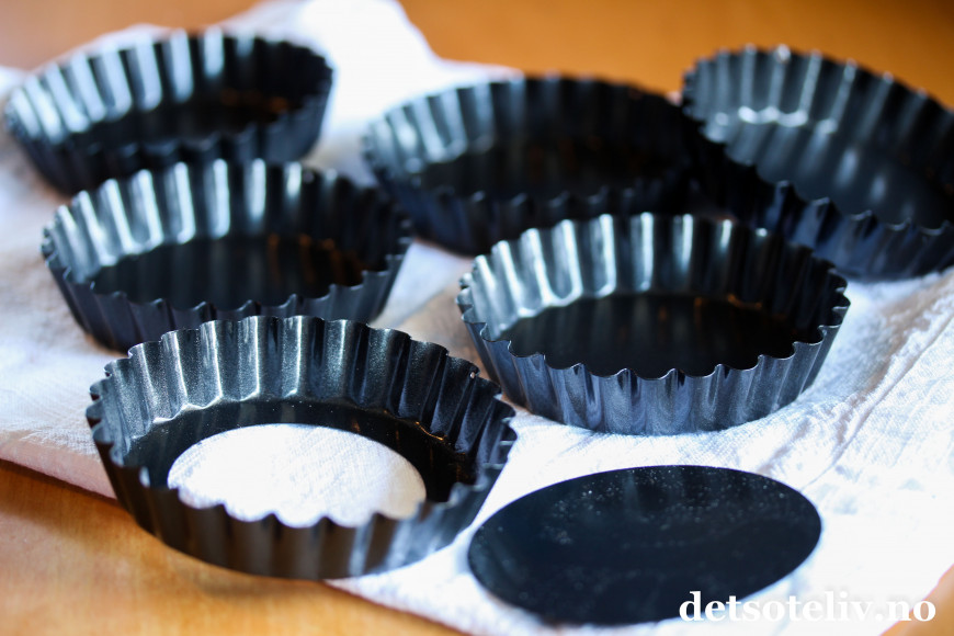 Klem kjeksmassen i bunn og kanter på terteformer som er ca. 10 cm i diameter.