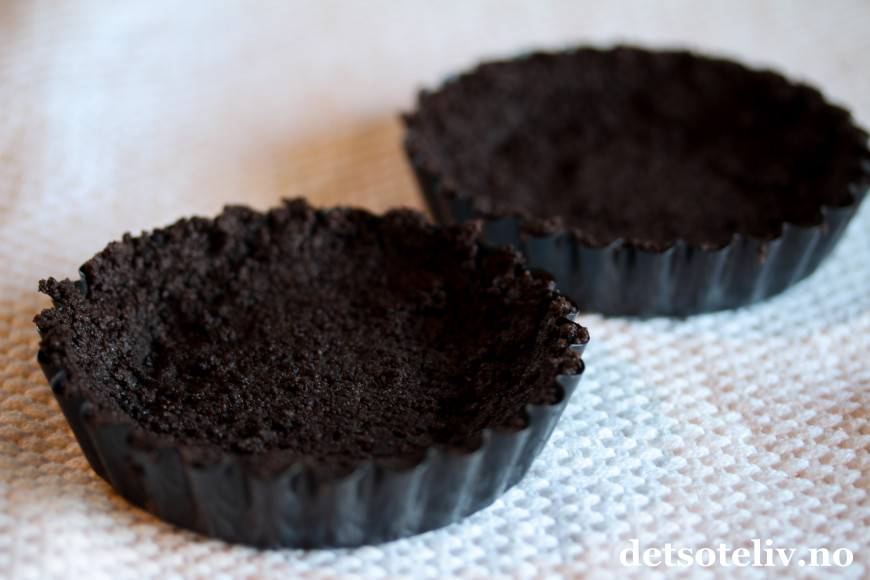 Sett tertebunnene på et brett som passer inn i kjøleskapet og la dem stå i kjøleskapet i minst 30 minutter, slik at kjeksbunnene fester seg.