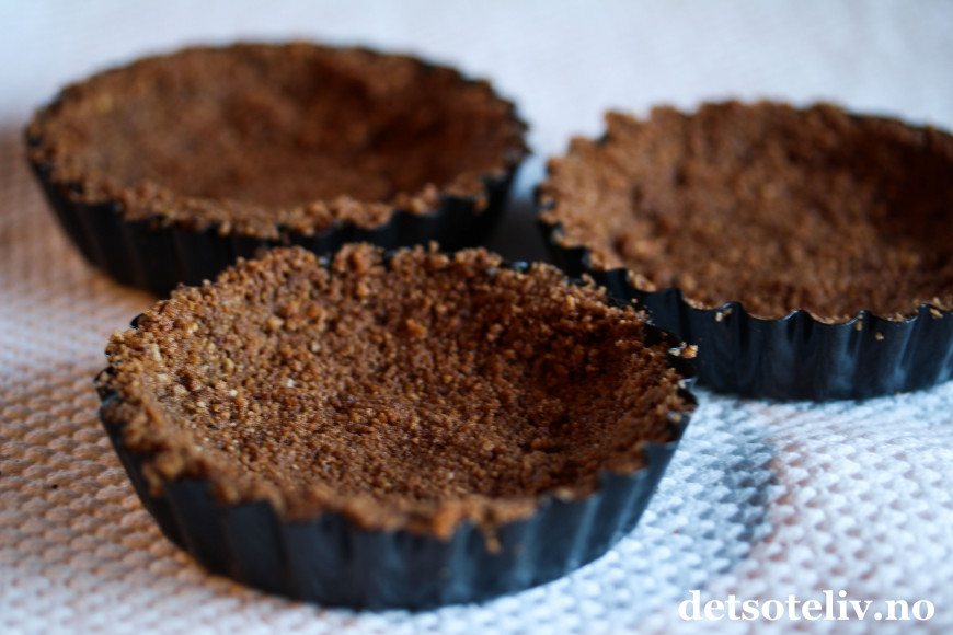 Klem kjeksmassen i bunn og kanter på terteformer som er ca. 10 cm i diameter. Sett tertebunnene på et brett som passer inn i kjøleskapet og la dem stå i kjøleskapet i minst 30 minutter, slik at kjeksbunnene fester seg.