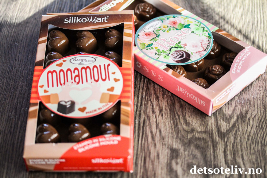 Hjemmelaget sjokoladekonfekt er enkelt å lage, særlig når man bruker silikonformer, som det finnes mange varianter av i nettbutikken til Bakeren og kokken. Her har jeg valgt meg romantisk hjerteform og roseform i det populære merket Silikomart.
