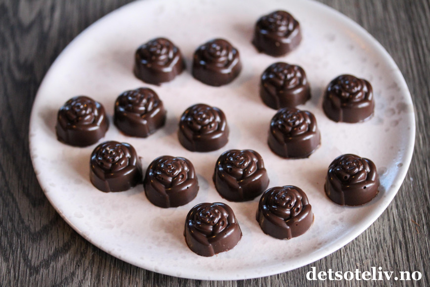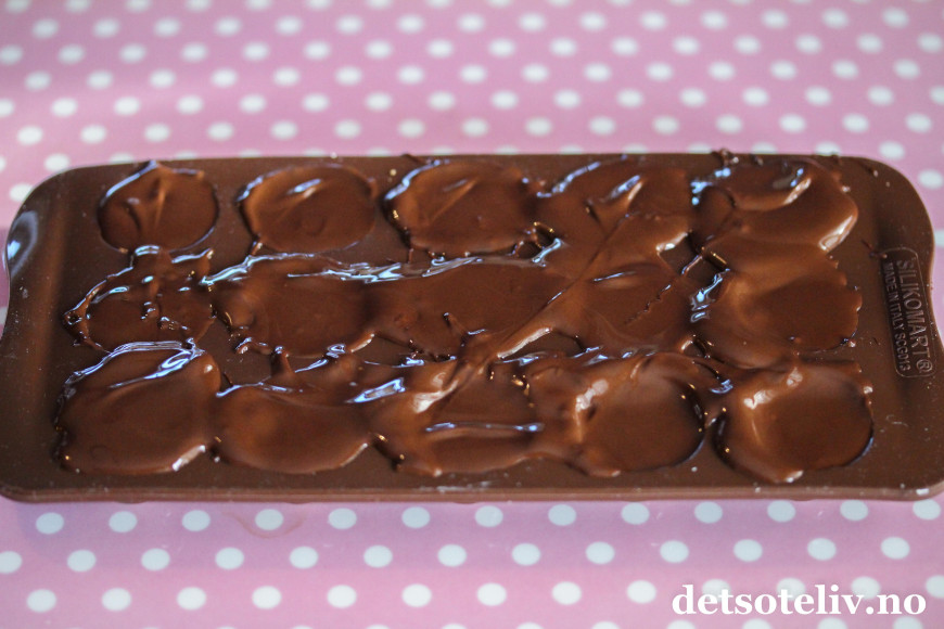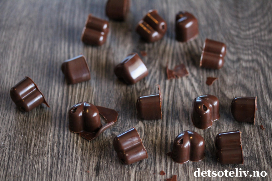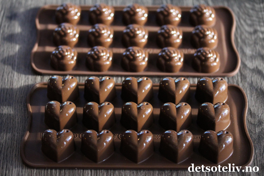 ♥ For at konfekten skal holde bedre og ikke smelte for raskt når du tar i den, bør du temperere den smeltede sjokoladen før du har den i formene. I praksis betyr det bare å avkjøle den smeltede sjokoladen til den er ca 30°C.