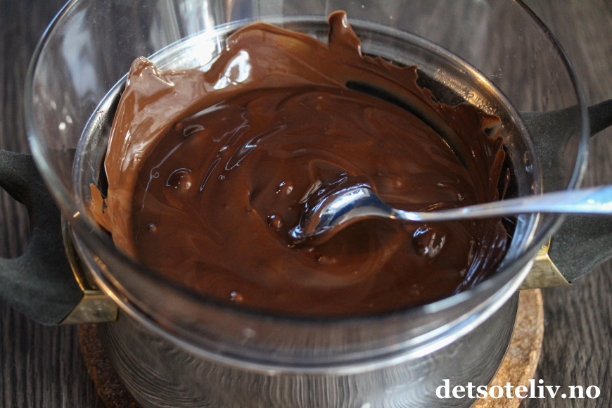 ♥ Du kan alternativt smelte sjokoladen i en skål i mikroen. Varm da sjokoladen i 1 minutt av gangen. Rør rundt mellom hver gang og slutt når sjokoladen har nesten smeltet. La da sjokoladen stå i noen minutter til den smelter helt.