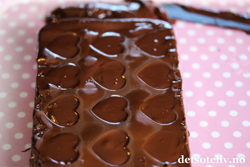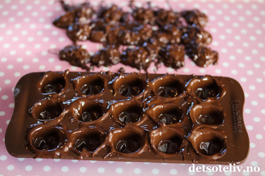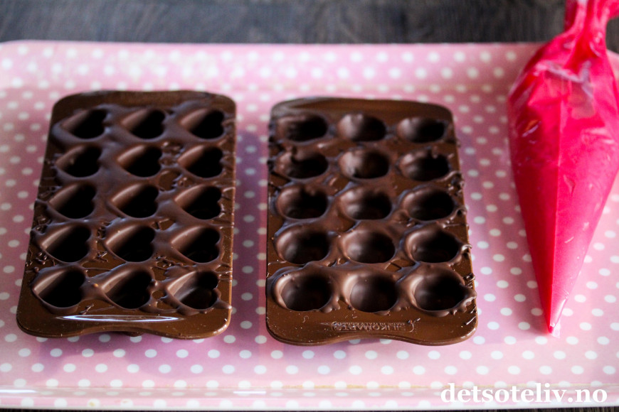 Gjenta med den andre formen og sett så begge i kjøleskapet, gjerne i en times tid så sjokoladekonfekten stivner ordentlig.