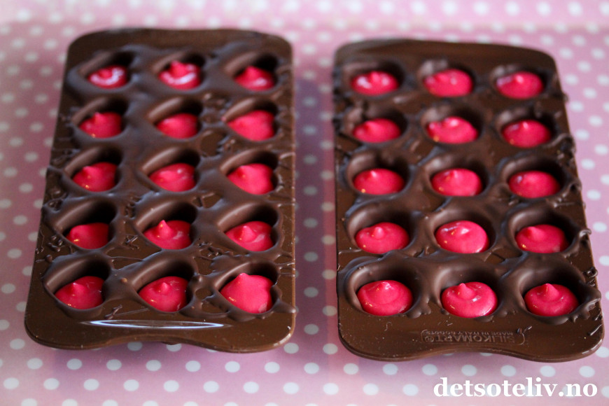 Ta formene ut av kjøleskapet når sjokoladeskallet har stivnet. Fyll opp med bringebærkremen. Husk at det må være litt plass igjen til å ha sjokolade på toppen. Sett formene tilbake i kjøleskapet i ca. en halvtime slik at bringebærfyllet får satt seg.