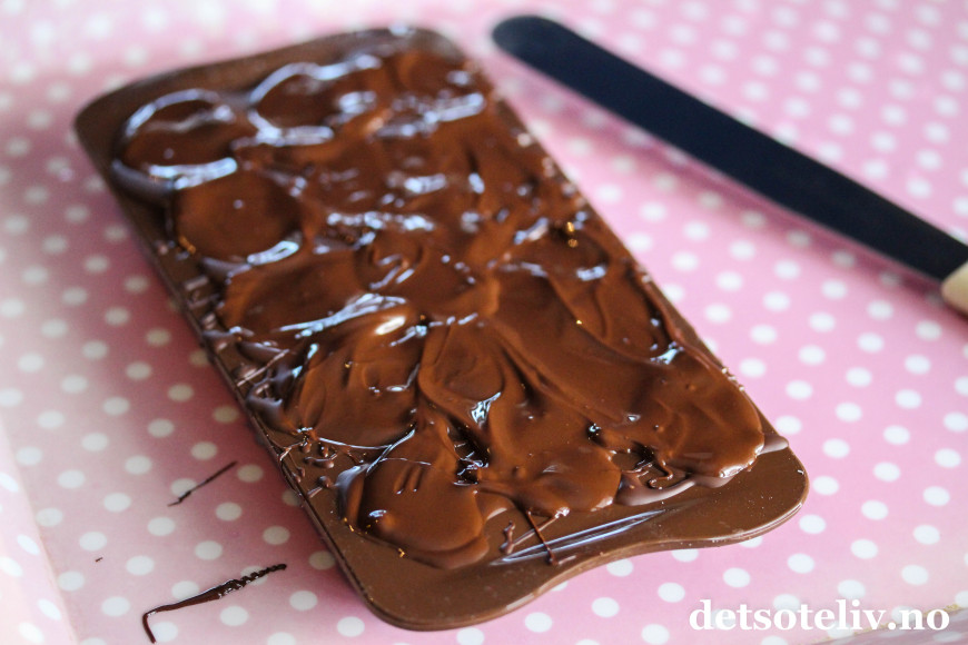 Sett formen på plastbrettet og skrap med en spatel, stekespade eller lignende, slik at overflødig sjokolade fjernes og toppen blir glatt.