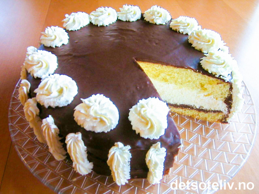 Sett den underste kakebunnen på et passende fat og dynk den eventuelt med litt melk. Smør et (nokså tynt) lag sjokoladeglasur over kakebunnen. Dekk med et tykt lag pisket krem (spar litt krem til pynt). Ha over den andre kakebunnen. Dekk hele kaken med sjokoladeglasur (se tips). Sett kaken kjølig en liten stund, slik at sjokoladeglasuren stivner litt. Pynt kaken deretter med resten av den piskede kremen.