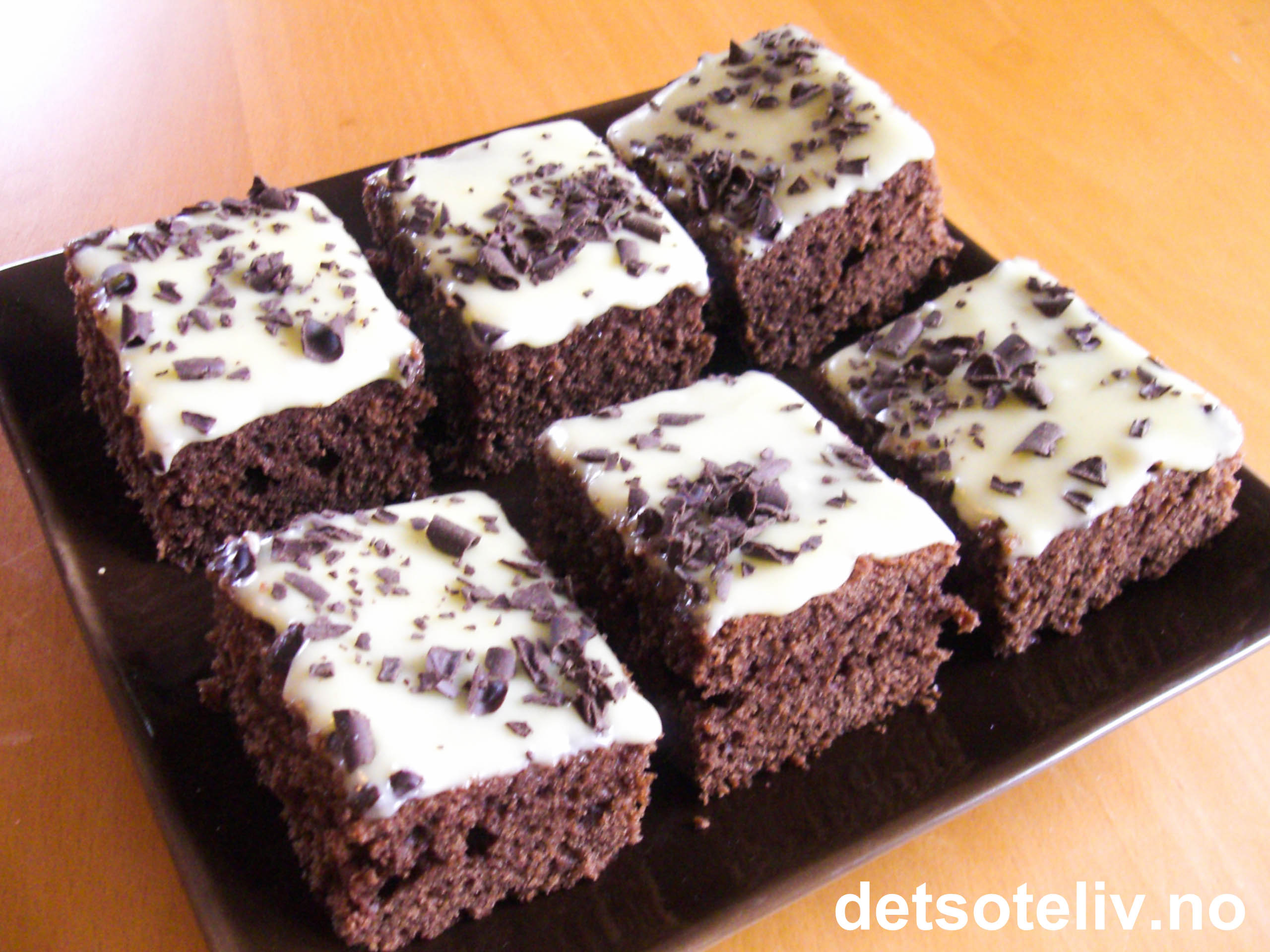 Dette er en saftig, mørk sjokoladekake som dekkes med en nydelig glasur laget med hvit sjokolade. Glasuren kan eventuelt farges med konditorfarge, men det er ikke gjort med kaken på bildet. Kakestykkene pyntes med raspet sjokolade og blir superdelikate!