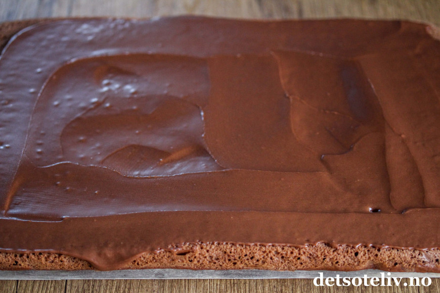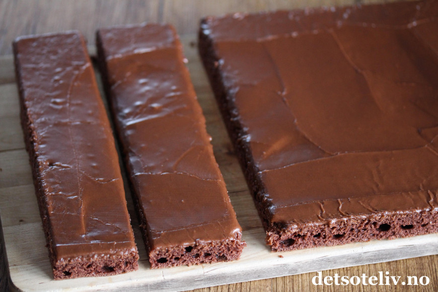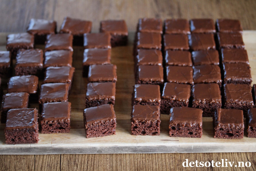 Hell deigen i en stor, bakepapirkledd langpanne (ca 30x40 cm). Stek kaken midt i ovnen ved 180°C i ca. 20 minutter (sjekk med kakenål at kaken er gjennomstekt før du tar den ut av ovnen). Avkjøl kaken i formen. Hvelv kaken ut av formen og fjern bakepapiret.