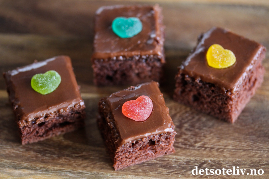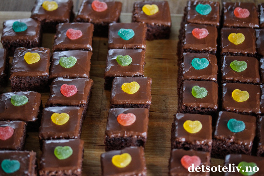 Fargene på hjertene kommer fint til sin rett oppå en mørk sjokoladekake, synes jeg.