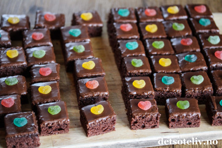 Jeg har denne gangen delt kaken i små biter og pyntet med nydelige, fargerike gelehjerter (også de fra Dr.Oetker).