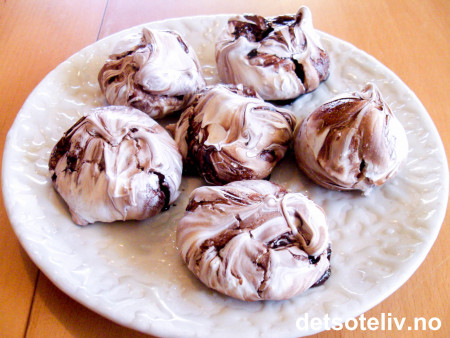 Teknikken med å piske marengs over vannbad gjør at marengsen får en litt seig konsistens i midten, og det er slik disse "Sjokolademarengsene" skal være.