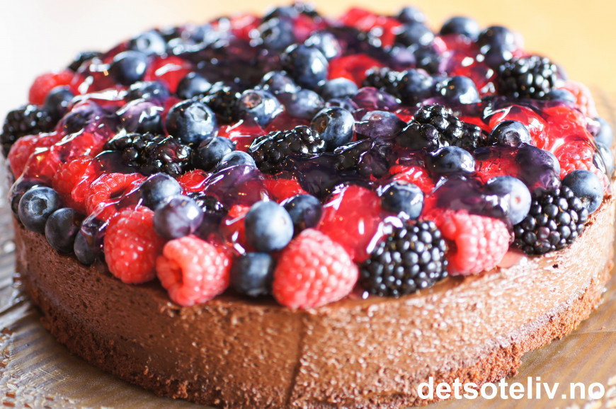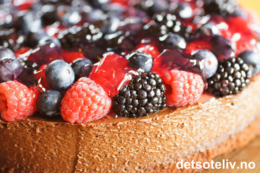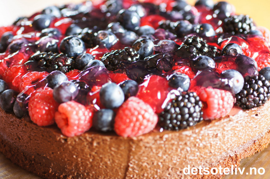 Legg masse friske bær på toppen av kaken. Smelt gelé (det gjøres raskt i mikro) og avkjøl til den romtemperert, men fortsatt flytende. Øs geléen over bærene så de blir blanke og glaserte. Sett kaken i kjøleskapet i et par timer så geléen får stivnet igjen.