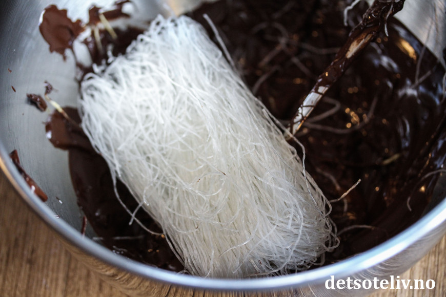 ♥ Vermicelli glassnudler er supertynne, asiatiske nudler laget av mungbønnemel eller rismel. Du får kjøpt dem i de fleste norske matbutikker. Merk at du ikke skal bløtlegge nudlene, men legge dem i den smeltede sjokoladen rett fra pakken, altså som helt knusktørre.