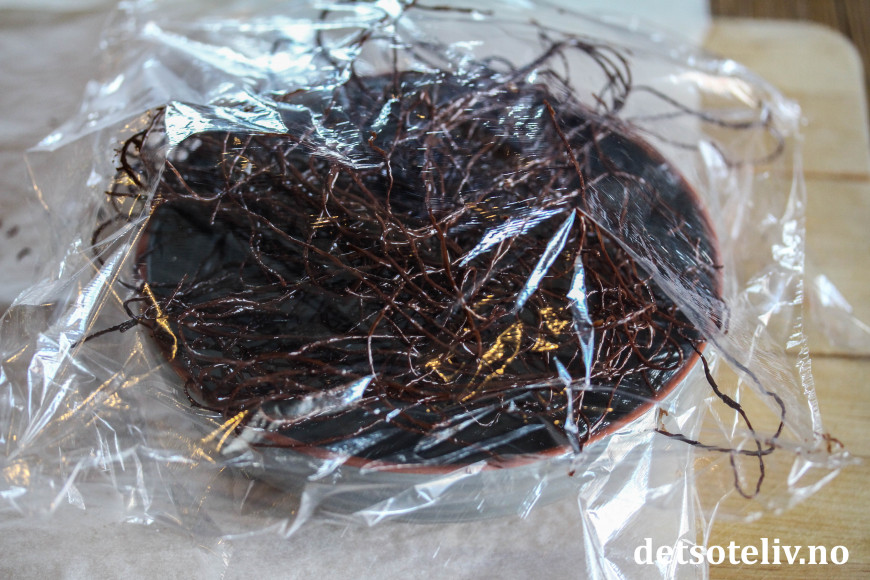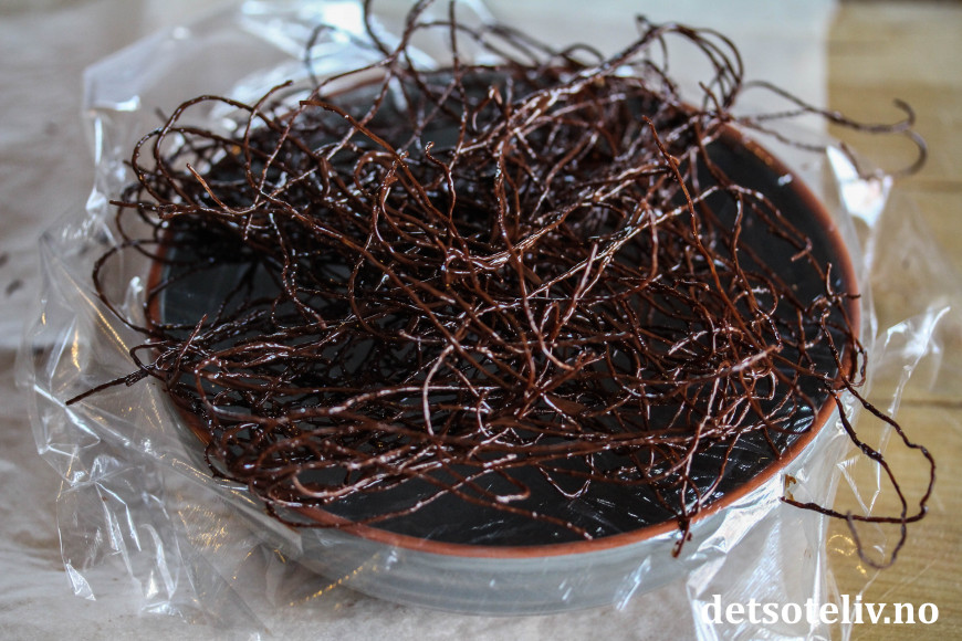 Alle nudlene skal bli dekket med sjokolade og nudlene skal dras såpass fra hverandre til at du får en "luftig", sirkelformet, flat nudelhaug.