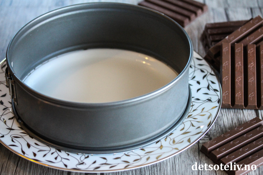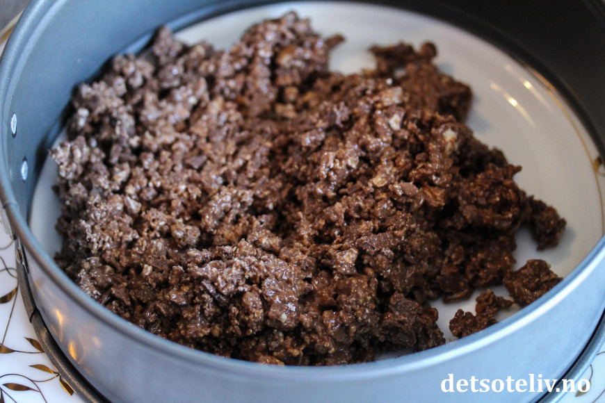 ♥ Vær nøye med å presse kjeksbunnen helt ut i kanten slik at det ikke blir en sprekk mot kakeringen, ellers kan sjokolademousseblandingen sive ut av formen.