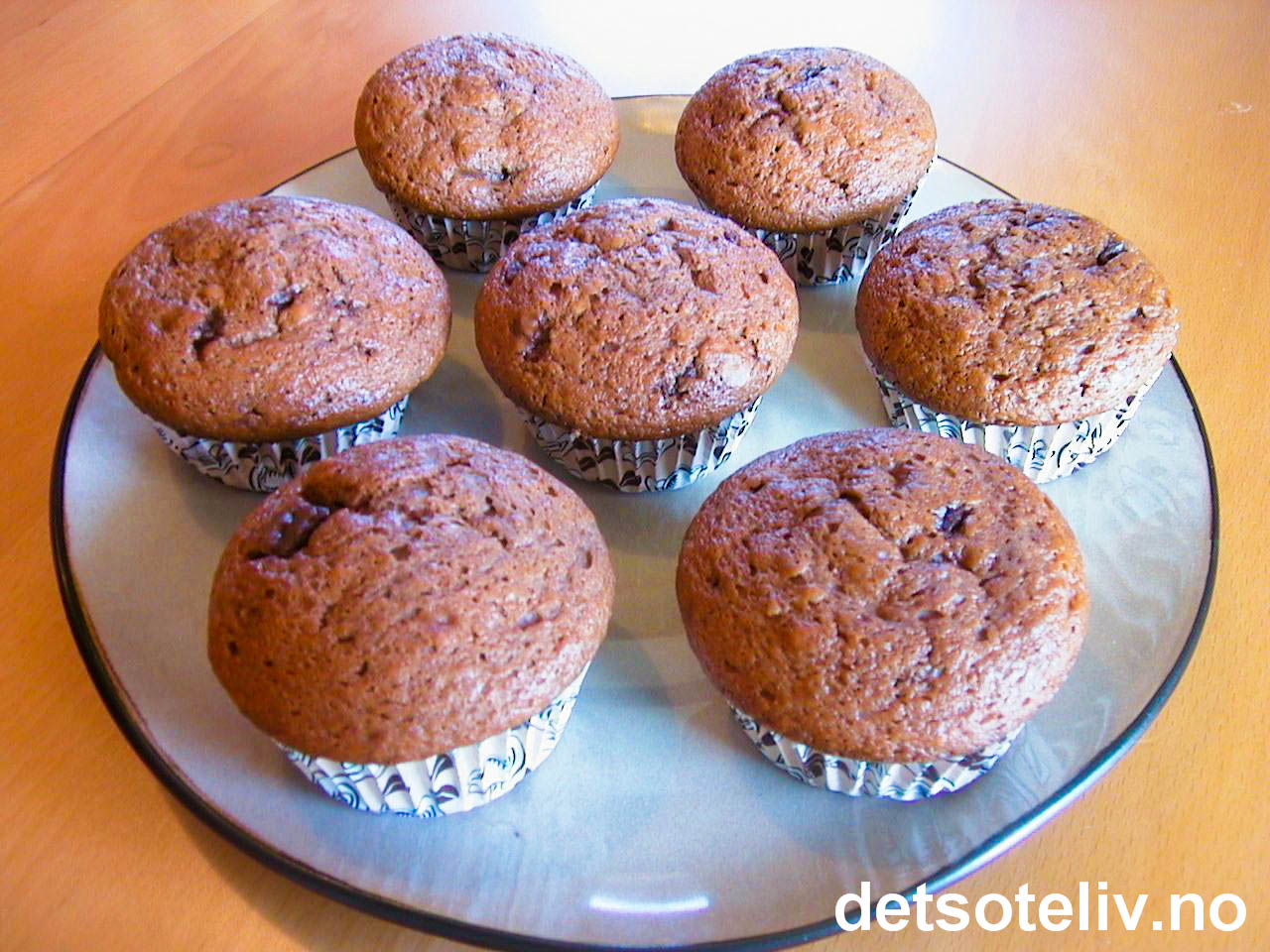Ha papirformer i muffinsbrett og fordel deigen i formene (se tips). Stekes på rist midt i ovnen ved 180°C i ca 30 min. Avkjøl muffinsene litt i formen. Løsne dem forsiktig fra kanten av formen med en skarp kniv og hvelv dem så ut av muffinsbrettet.