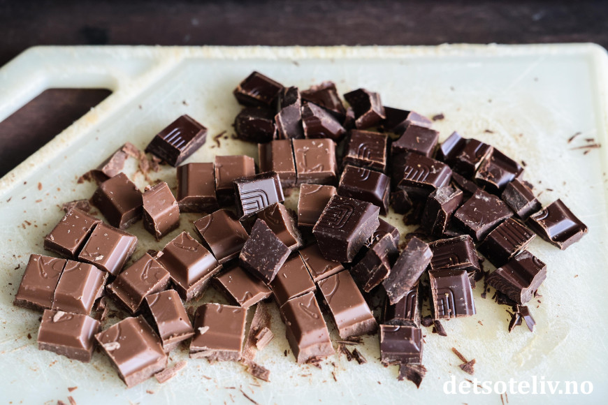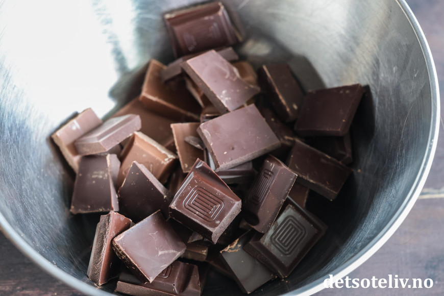Start med å lage klar sjokoladeganachen siden den må stå en stund for å tykne.