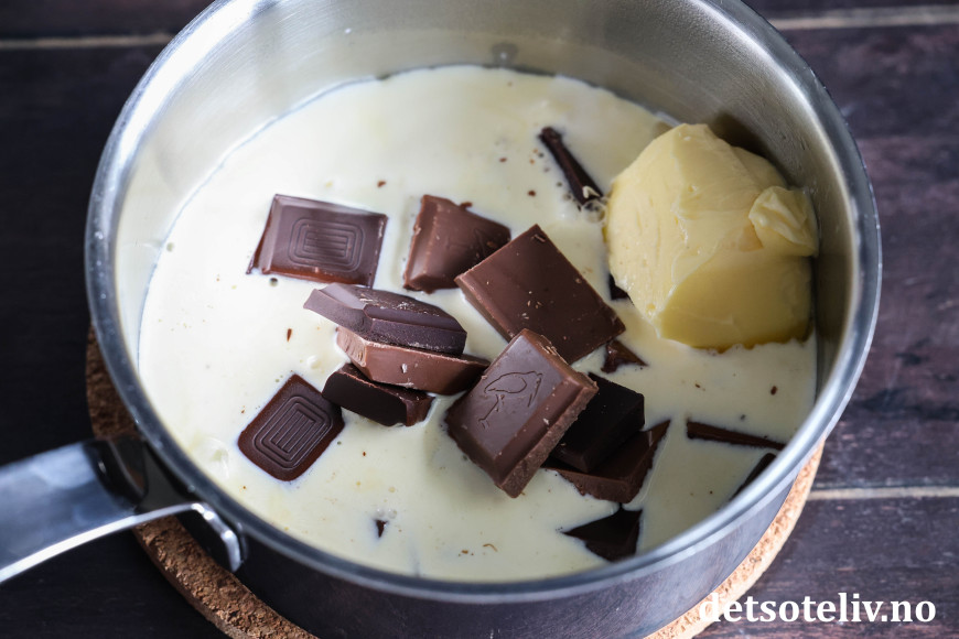 Start med å lage klar sjokoladeganachen siden den må stå en stund for å tykne. Ha kremfløte i en liten kjele og gi fløten et oppkok. Ta kjelen av platen. Brekk opp melkesjokolade og kokesjokolade i mindre biter. Ha sjokoladebitene og smør i kjelen og la dette smelte i den varme fløten. Rør blandingen jevn.