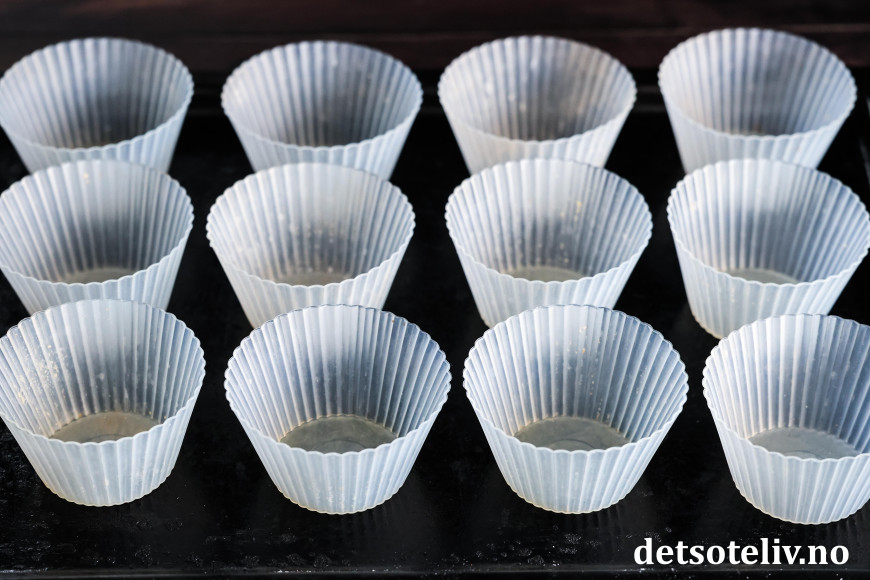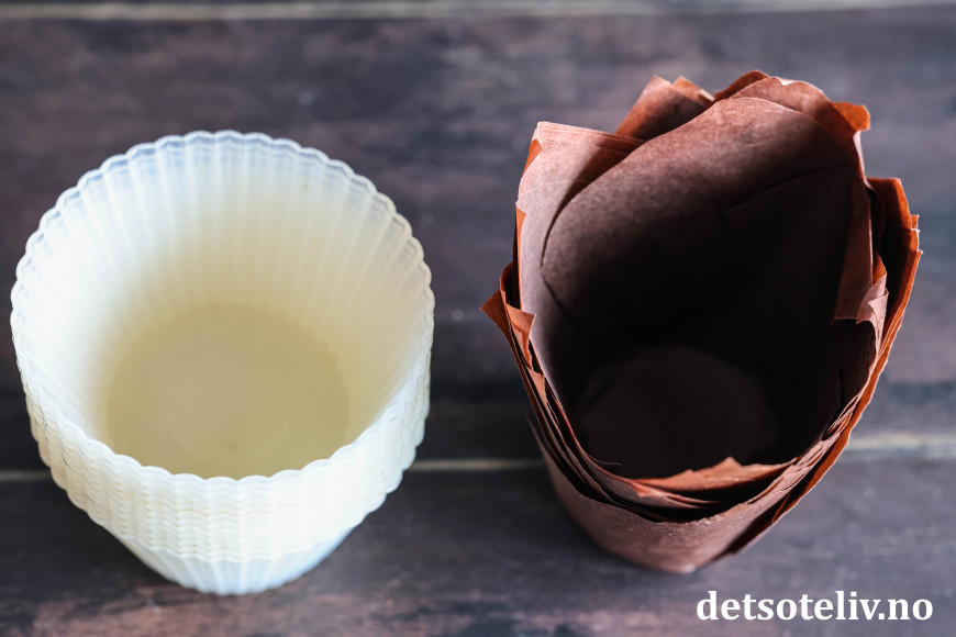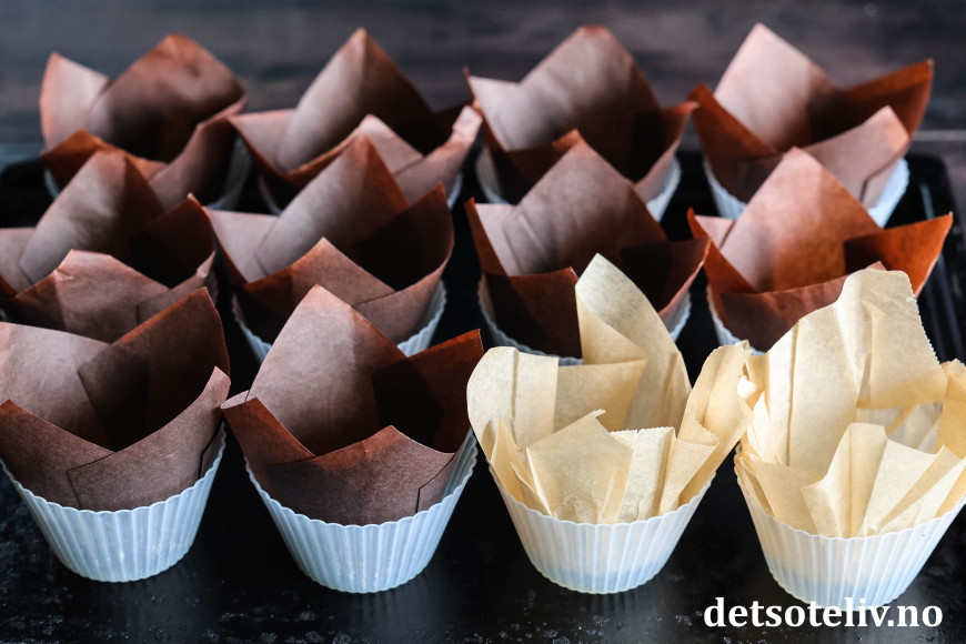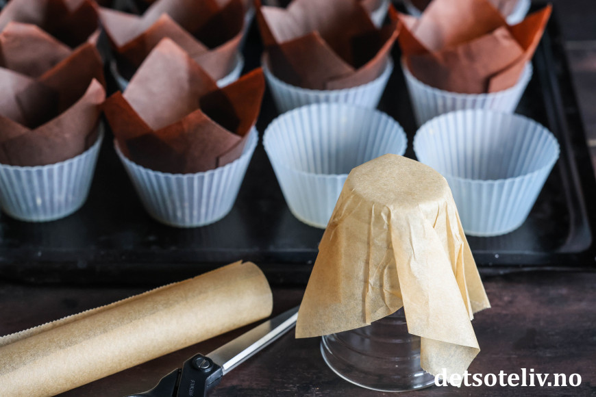 ♥ For at muffinsene skal holde fasongen under stekingen, bør du helst ha et muffinsbrett beregnet på store muffinsformer som du setter papirformene inn i. Alternativt kan du bruke store silikonformer, som jeg har brukt her.
