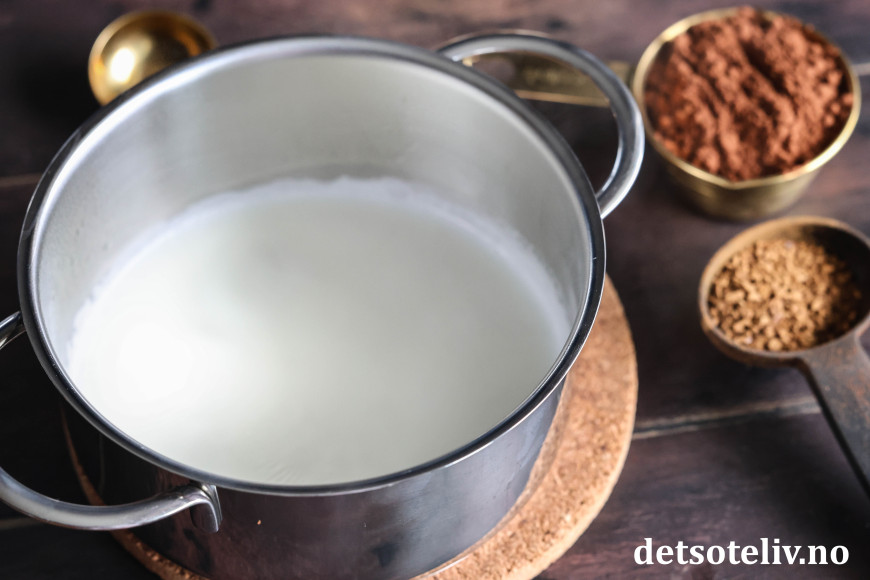 Ha melken i en kjele og gi den et oppkok. Ta kjelen av platen. Tilsett kakaopulver og frysetørket kaffepulver.