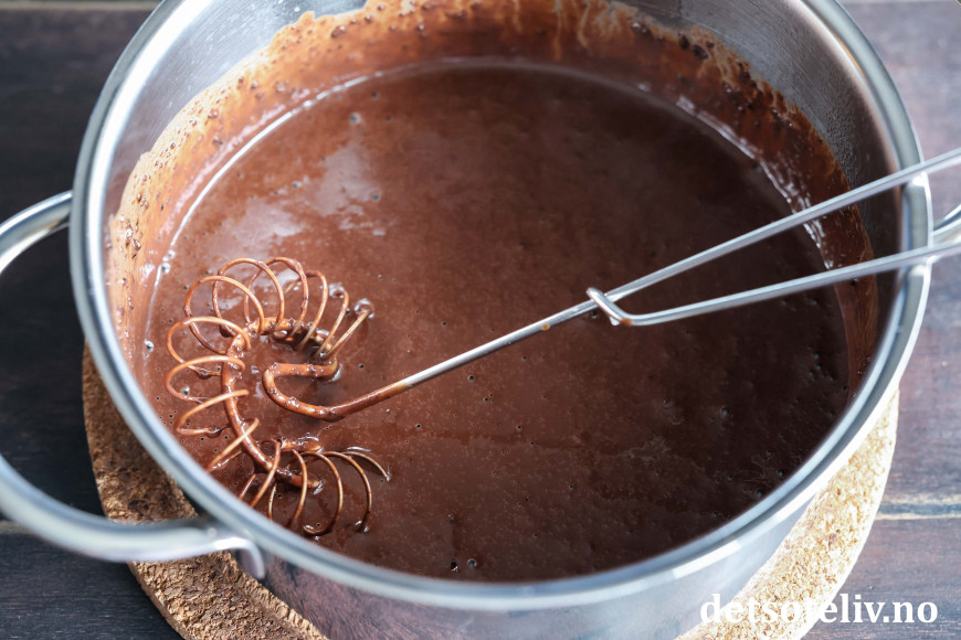 Ha sjokoladebitene og smør i kjelen og la dette smelte i den varme fløten.