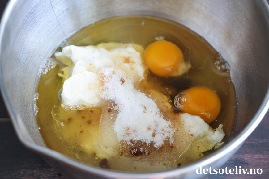 Visp sammen gresk yoghurt, olje, egg, hvitt og brunt sukker og vanilje.