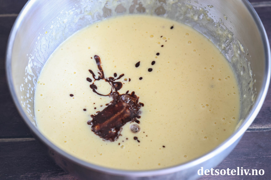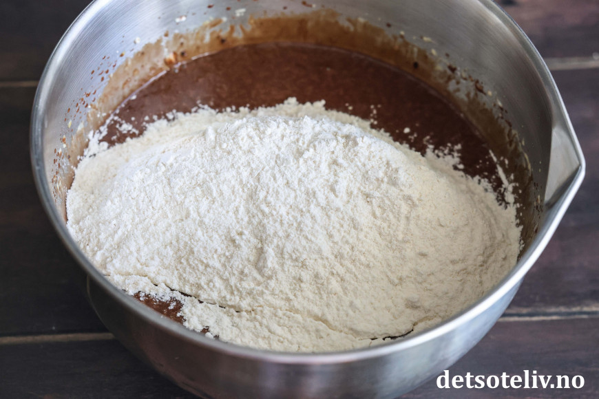 Sikt hvetemelet sammen med natron og bakepulver. Bland dette inn og rør til du får en jevn og klumpfri deig.