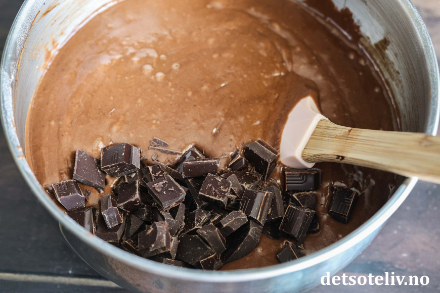 Hakk kokesjokolade opp i store biter og vend sjokoladebitene inn i deigen.