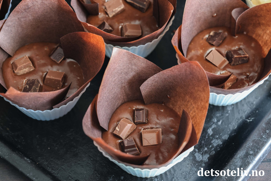 Fyll deigen i 12 store muffinsformer (se tips). Skjær melkesjokolade og kokesjokolade i firkanter og legg noen av dem på toppen av hver muffins.