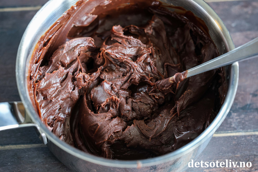 ♥ Det tar tid før sjokolade ganache får den rette, tykke, kremete konsistensen (det er sjokoladen og smøret som må stivne for at kremen skal bli tykk). Vil du raske på prosessen, kan du sette kjelen en stund i kjøleskapet eller en kort stund i fryseren. Merk imidlertid at sjokoladekremen blir helt stiv og hard hvis du lar den stå kaldt for lenge, så sjekk konsistensen ofte ved å røre rundt i kremen. Hvis det skulle skje at kremen har blitt for hard, kan du la kjelen stå i romtemperatur til kremen har blitt myk igjen. Det tryggeste er imidlertid å la sjokoladeganachen tykne gradvis i romtemperatur.