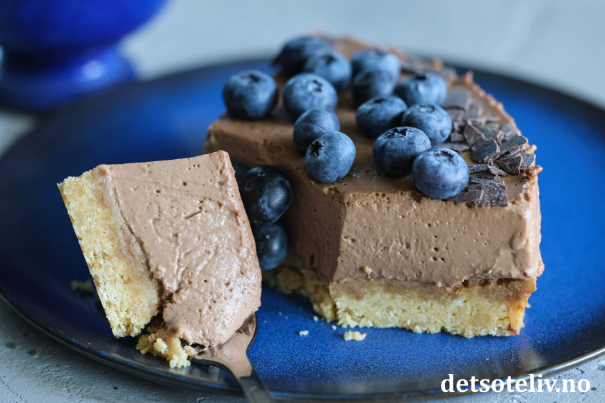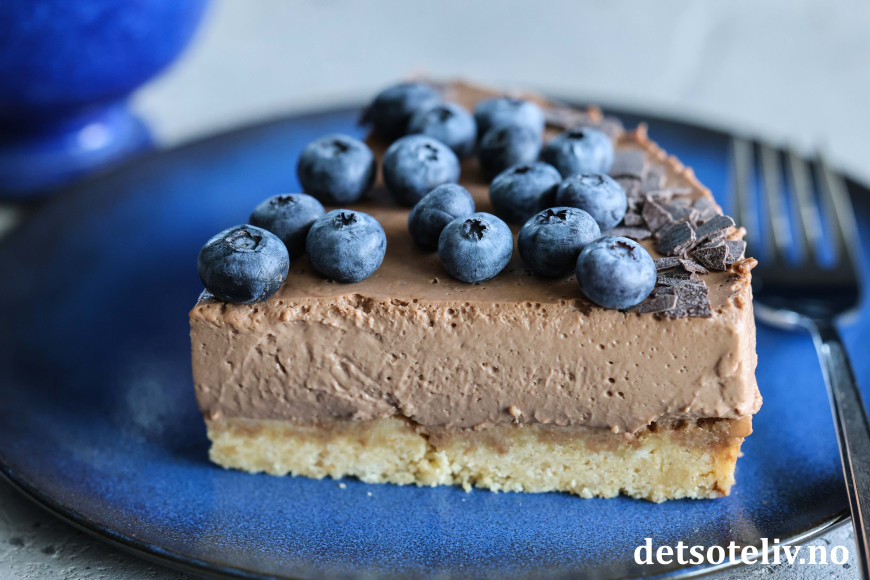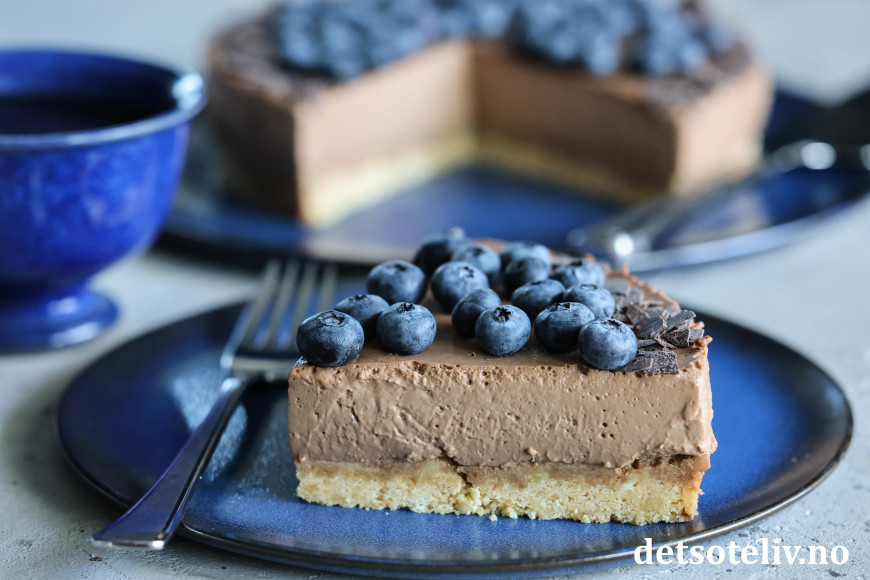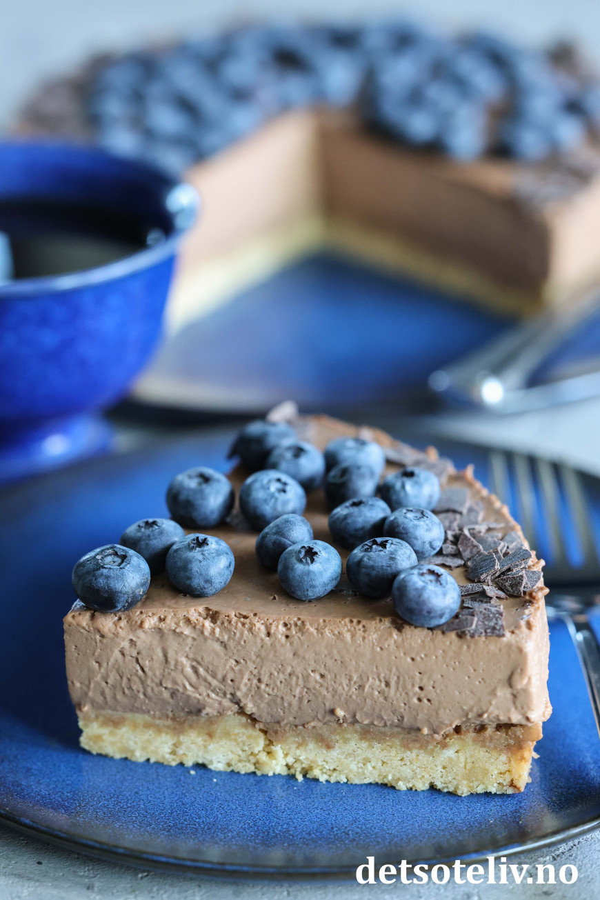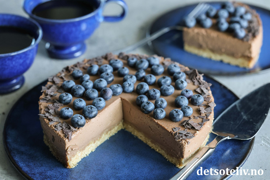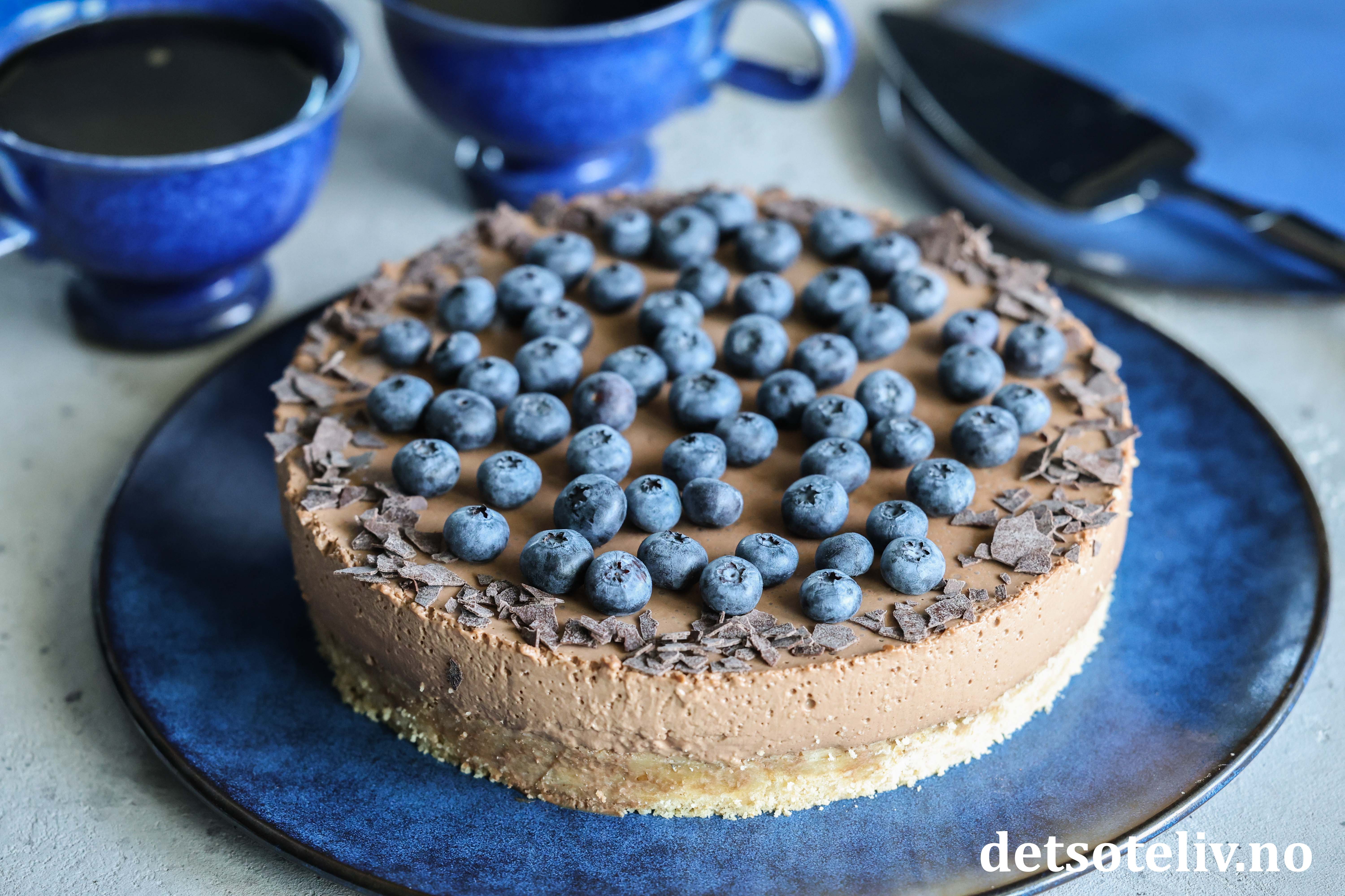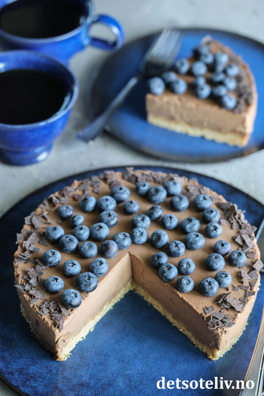 Når kaken har stivnet, løsnes kakeringen forsiktig fra kaken med en tynn kniv. Fjern kakeringen og pynt toppen av kaken med masse blåbær og sjokoladespon (eller fint hakket sjokolade).
