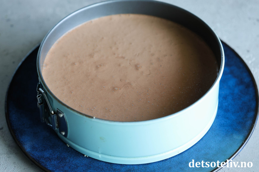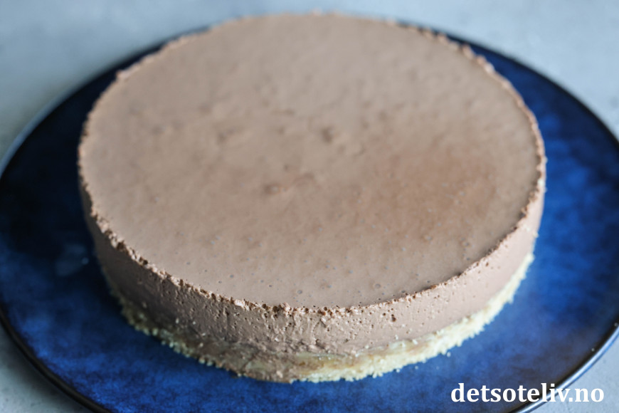 Hell blandingen over kjeksbunnen i kakeformen og sett kaken i kjøleskapet i noen timer (eller over natten), så ostefromasjen stivner.