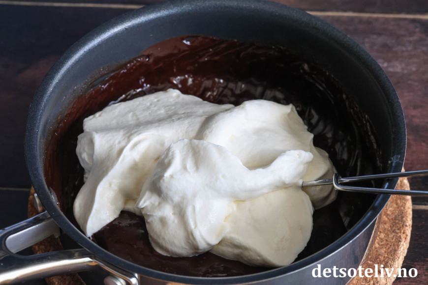 Pisk kremfløten til tykk krem i en bolle for seg. Vend litt og litt av kremen inn i sjokoladeblandingen. Flytt sjokoladeblandingen over i en større bolle.